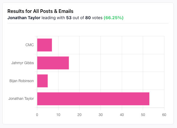 🥇 Best subscriber comment (JT): “As long as the Colts offense is so dominant & he's the 3 down back he'll continue to dominate as long as he stays healthy. The 49ers are struggling with injuries which could keep CMC away from the end zone more than we'd like, the Falcons are having ups & downs, & Gibbs is epic on a great offense, but shares too much with Montgomery for me to want him over Jonathan right now. This is only rest of season, Dynasty rankings if I'm not chasing a championship right now adjust a lot”