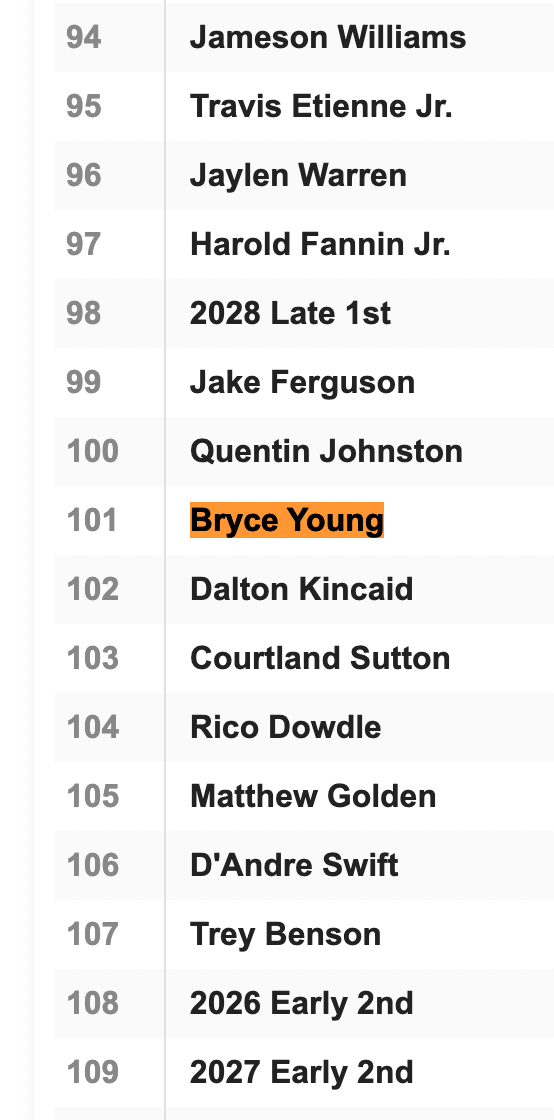 Our take: Tetās appearance in this newsletter has more to due with the guy we led with tonight (Bryce Young) than his actual ability on the field. I definitely wouldnāt sell low on Tet, but you could get a good haul for him if youāre contending. We have him at 34 overall in our consensus rankings, right by names like Nico Collins (31 OVR), Bucky Irving (35 OVR), James Cook (37 OVR), and Saquon Barkley (39 OVR) ā all guys who should hold more value than him down the stretch.