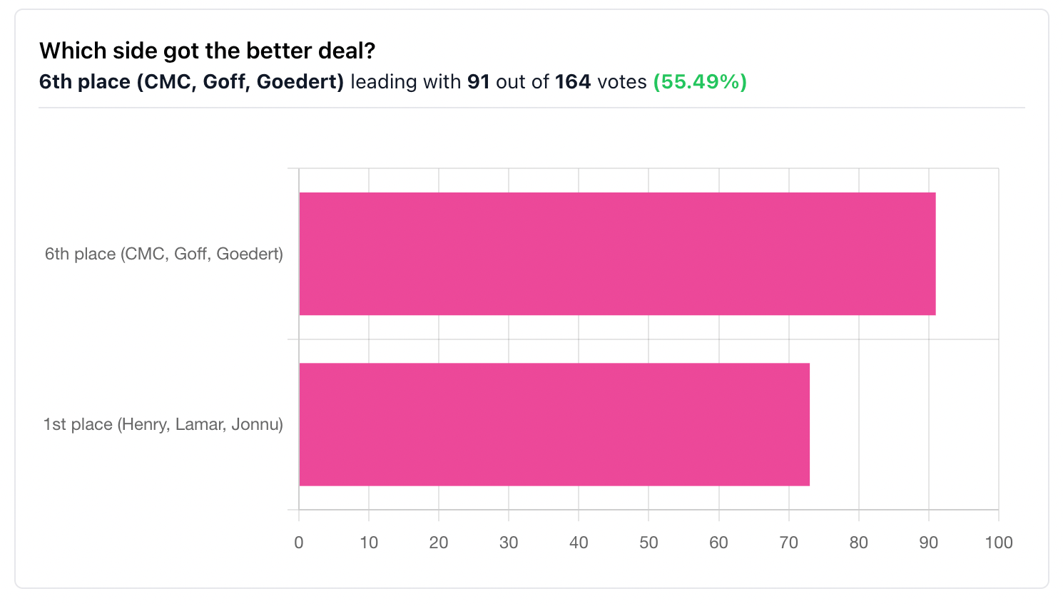 Our take: I’m firmly in the camp of Lamar is worth more than those 3 assets combined. He’s the #3 overall-ranked player in our consensus. I get CMC is having a great year, but how many more does he have in him? 1? 2 maybe?